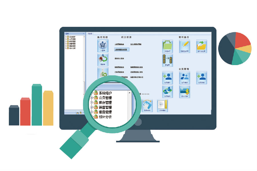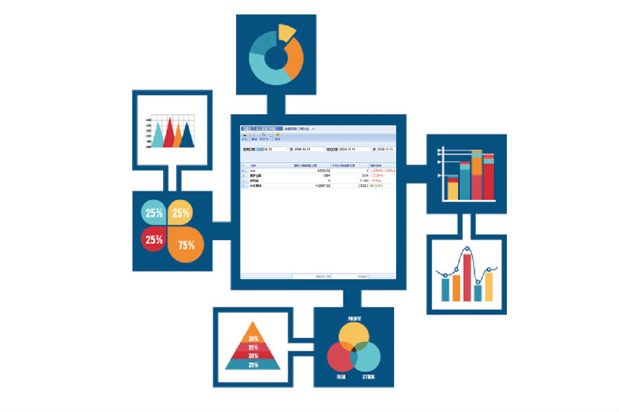 決策分析:從“庫存進出分析”,“銷售分析”,“會員銷售”“營業(yè)員業(yè)績”等方面進行分析,通過分析可以清楚知道:商品的進、調、存明細表、庫存貨齡、各類商品銷售比重分析、銷售排行,門店排行、商品排行、銷售任務完成進度等。