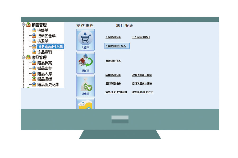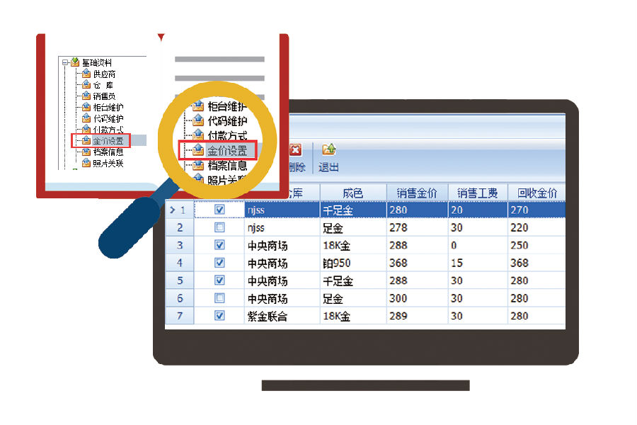 銷售業(yè)務:支持按件、按克兩大銷售計價方式。包括銷售明細、收款方式、銷退明細、舊料回收、贈品管理、優(yōu)惠細則、積分計算、短信發(fā)送等具體功能。
