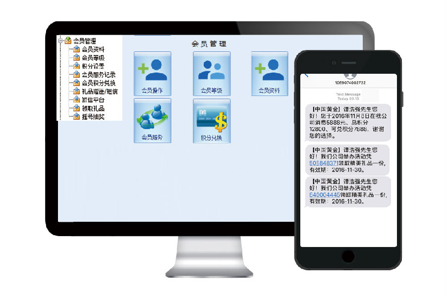會員管理:記錄會員基礎信息、消費、銷退、積分產生、售后回訪、禮品贈送、積分兌換等。結合短信服務平臺,能夠在消費時、節(jié)假日、會員生日等期間發(fā)送相應的短信通知,提升會員對企業(yè)的認可度。